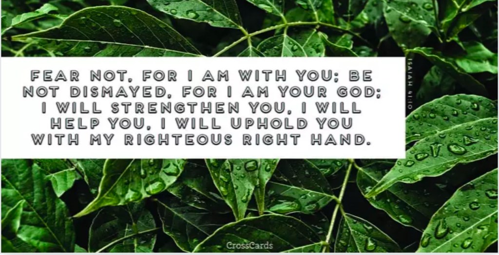 Isaiah 41 verse 10, “So do not fear, for I am with you; do not be dismayed, for I am your God. I will strengthen you and help you; I will uphold you with my righteous right hand.”